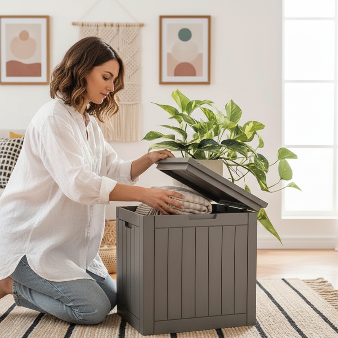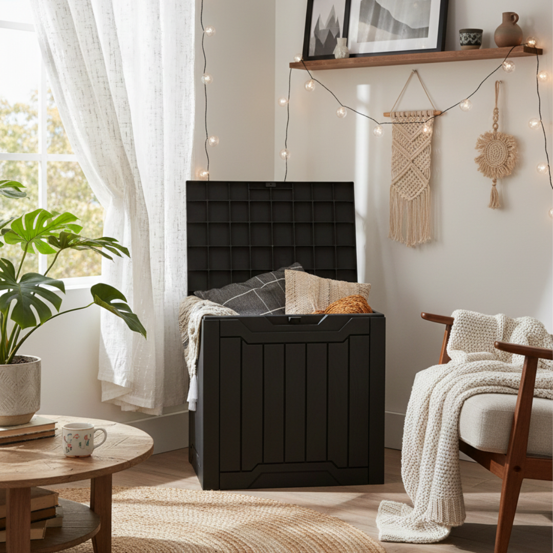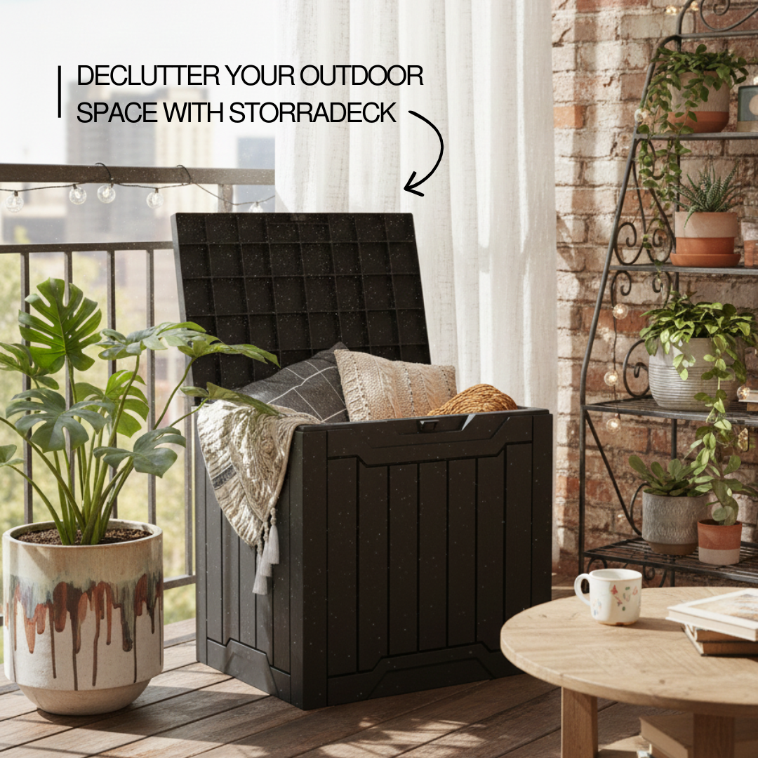 StorraDeck, a weather-resistant and spacious storage solution designed for patios, decks, and gardens. Whether you need to store cushions, gardening tools, pool accessories, or packages, this resin deck box ensures your essentials stay dry, secure, and neatly organized—all while enhancing your outdoor aesthetics.